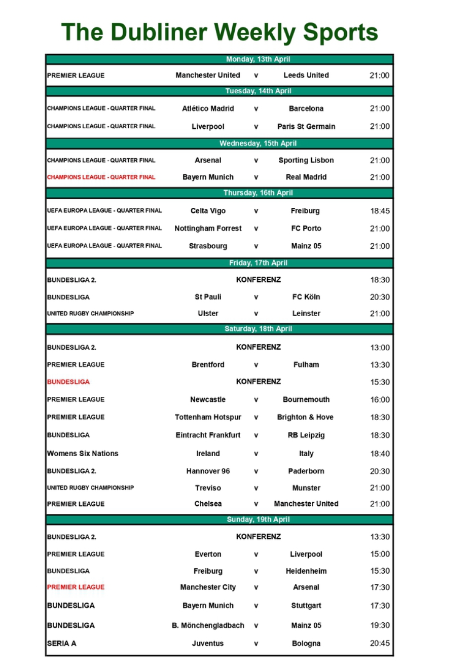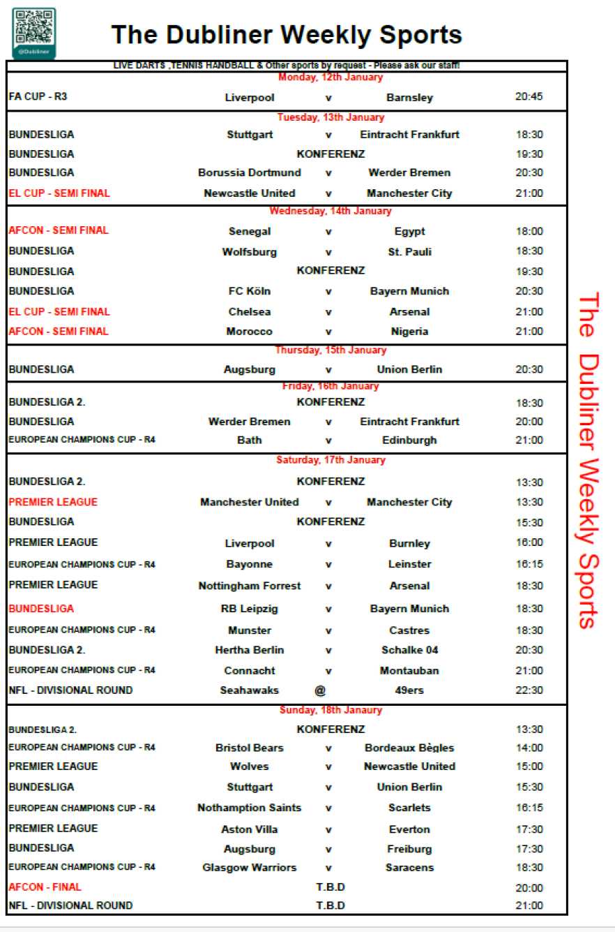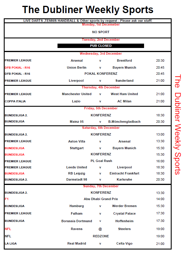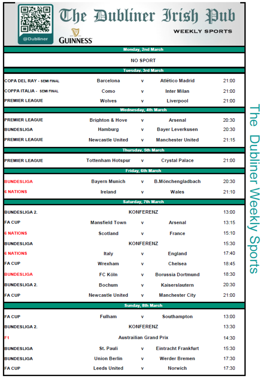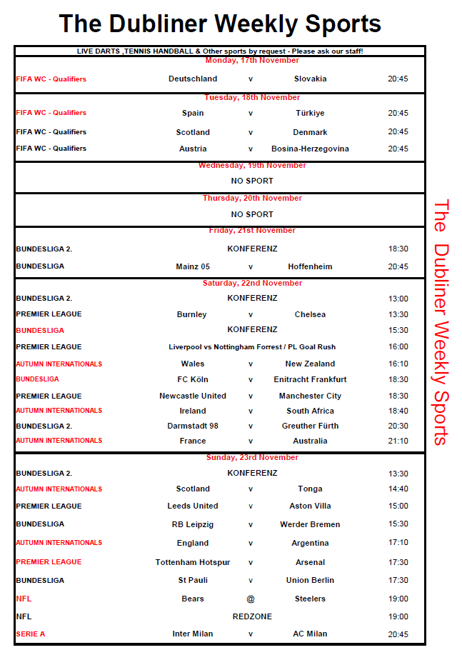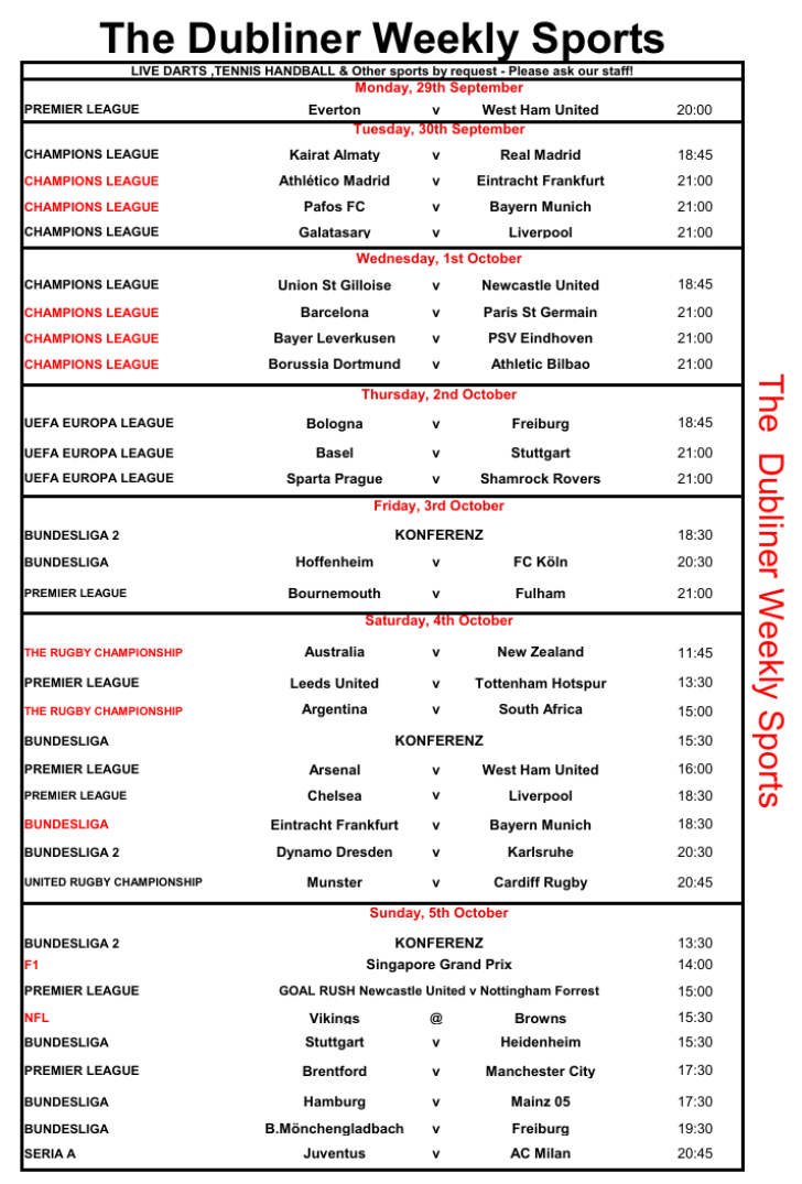 Mit 12 Flachbildschirmen mit HD Qualität ist The Dubliner "The Place to Be" wenn Sie eine breite Auswahl an Sport sehen möchten. Von Fußball über Rugby bis Golf - wir zeigen es! Informieren Sie sich über unser wöchentliches Sportangebot auf dem "Dubliner Weekly Sports" Plan. Auf Anfrage zeigen wir auch gerne nicht aufgelistete Sportereignisse.